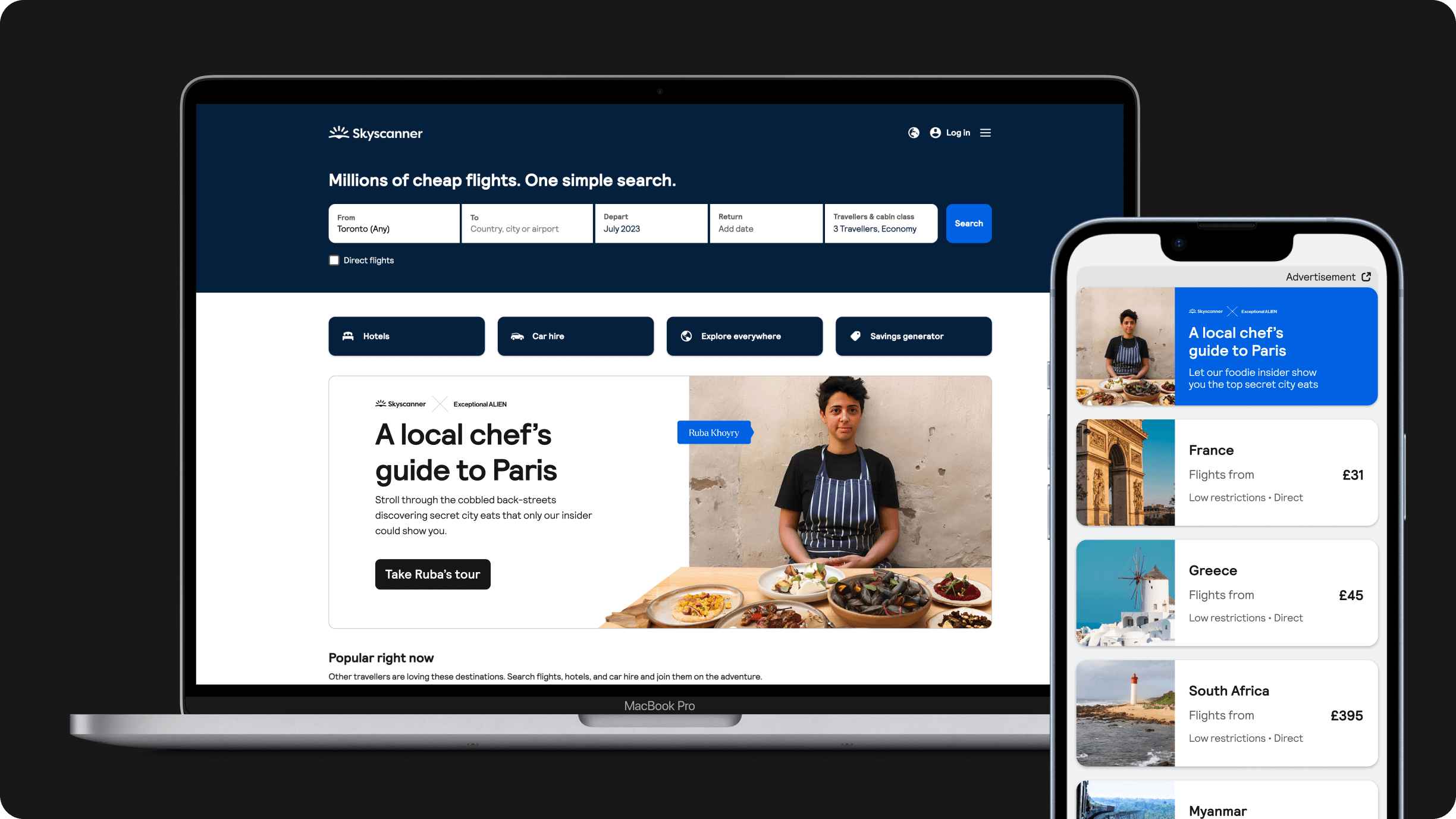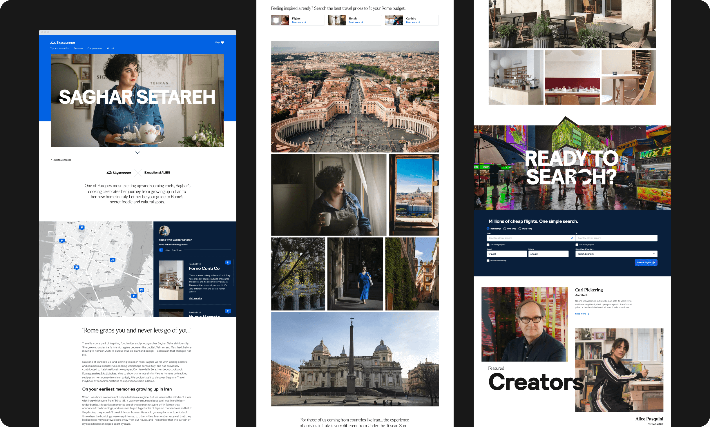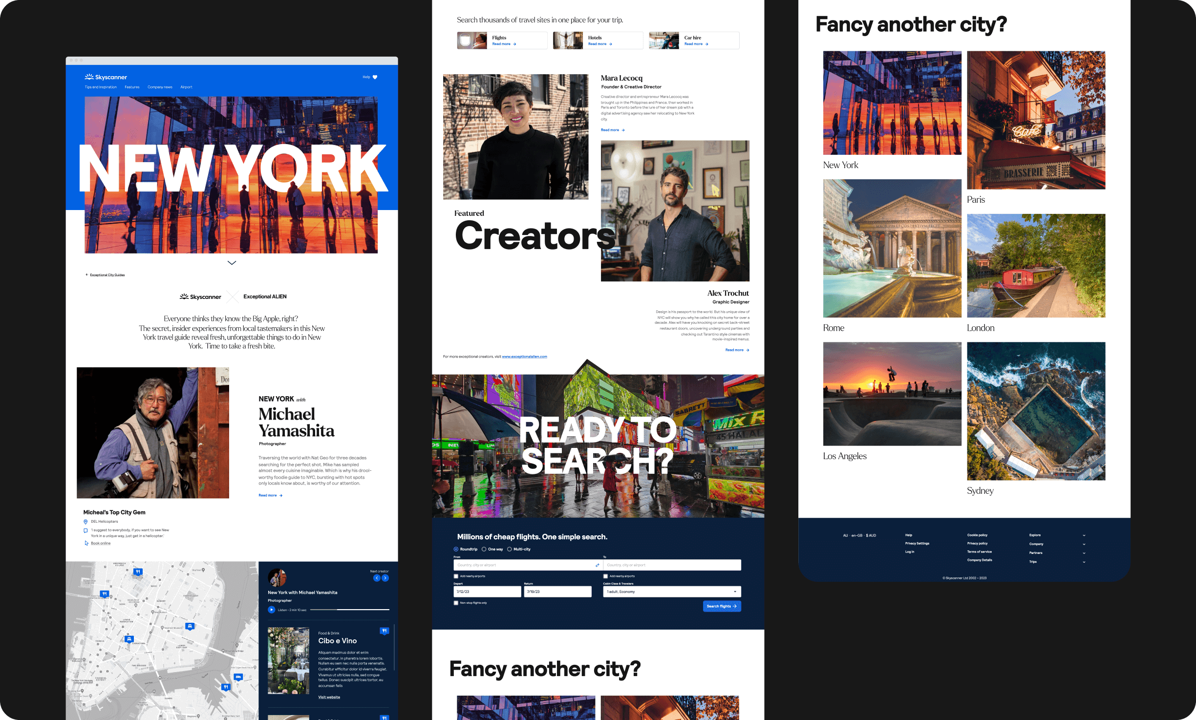 Almost 53% of visitors to Skyscanner don't have a destination in mind. We set out to offer fresh perspectives on well-trodden (and searched) cities, partnershiping with Exceptional aliens creators who peeled back the layers. Creating a social and content campaign combined with a complete overhaul of our landing experience to link with our developing master brand world.