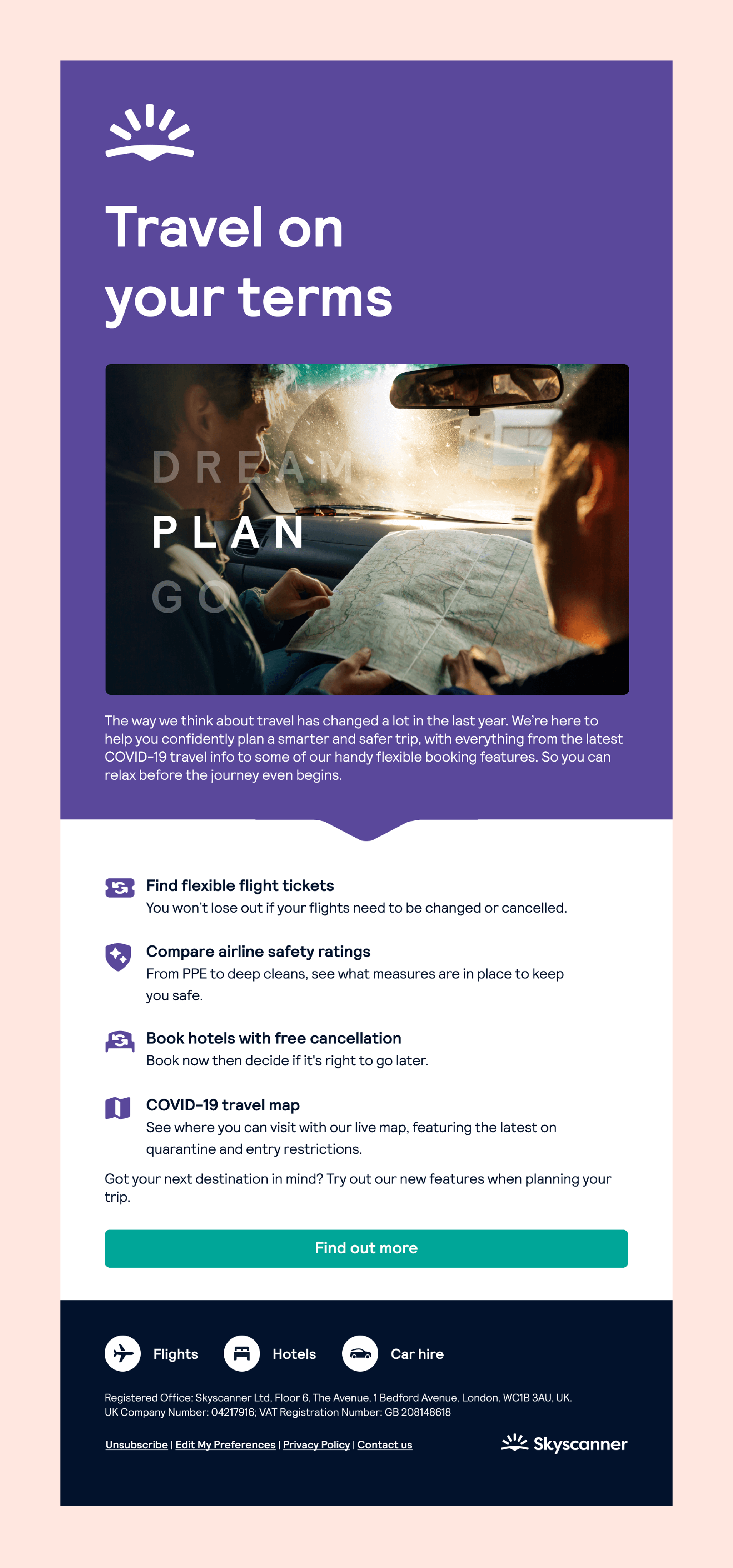 Prime travellers to start thinking about travel in 2021 and helping drive the travel recovery from Covid. Measurement of success is audience sessions driven organically to the Skyscanner owned experience in eight core markets across the globe.